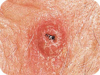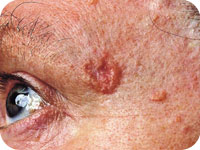 A thickened, red scaly spot that may bleed easily, crust or ulcerate. Grows over some months, usually on areas often exposed to the sun. More likely to occur in people over 50 years of age.